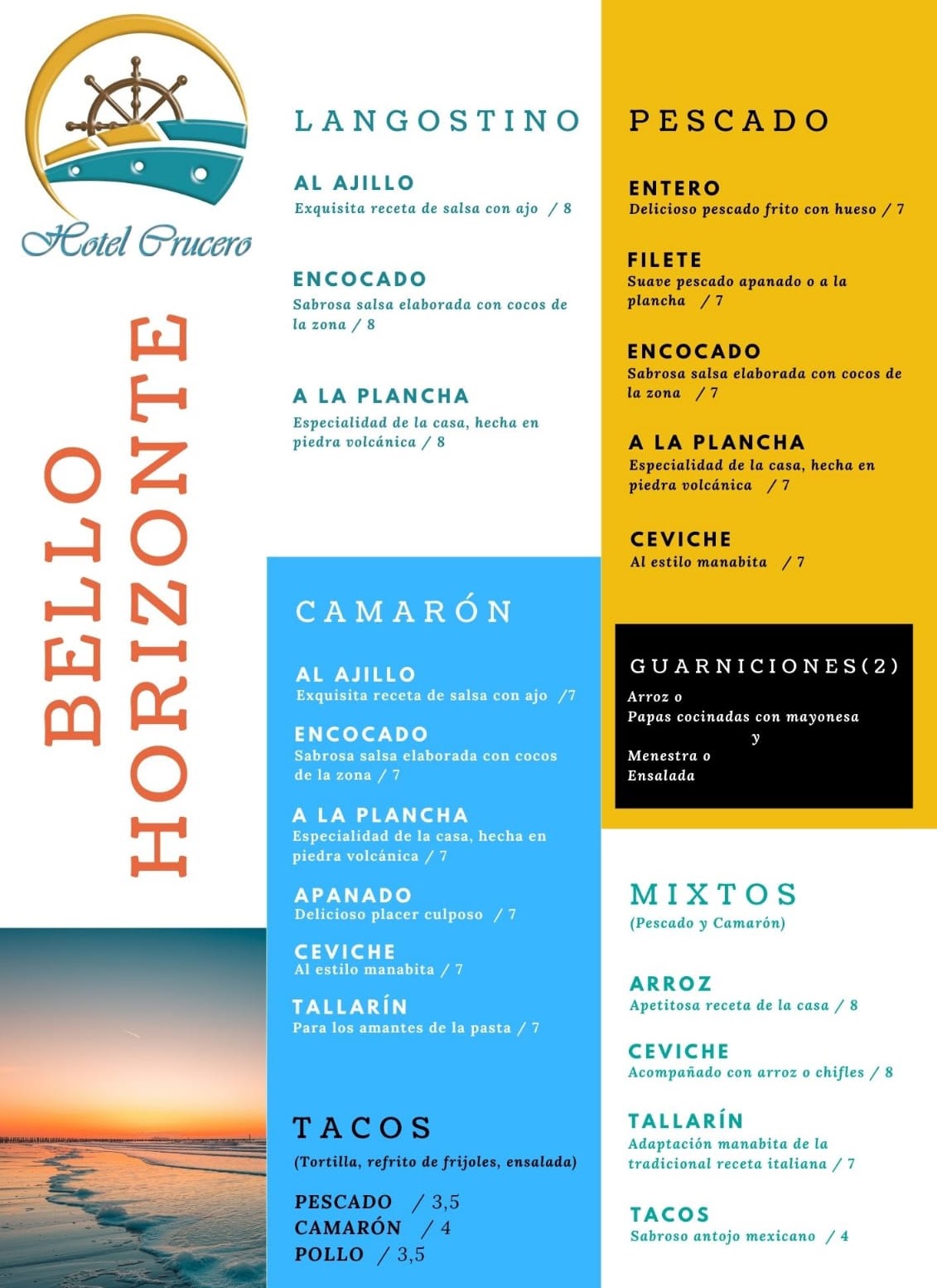 ¡Disfrute de una vista impresionante mientras deleita su paladar con los sabores de Manabí! Nuestro restaurante frente al mar combina la belleza natural de Cojimíes con la deliciosa gastronomía de la región.¡Una experiencia única para sus sentidos!